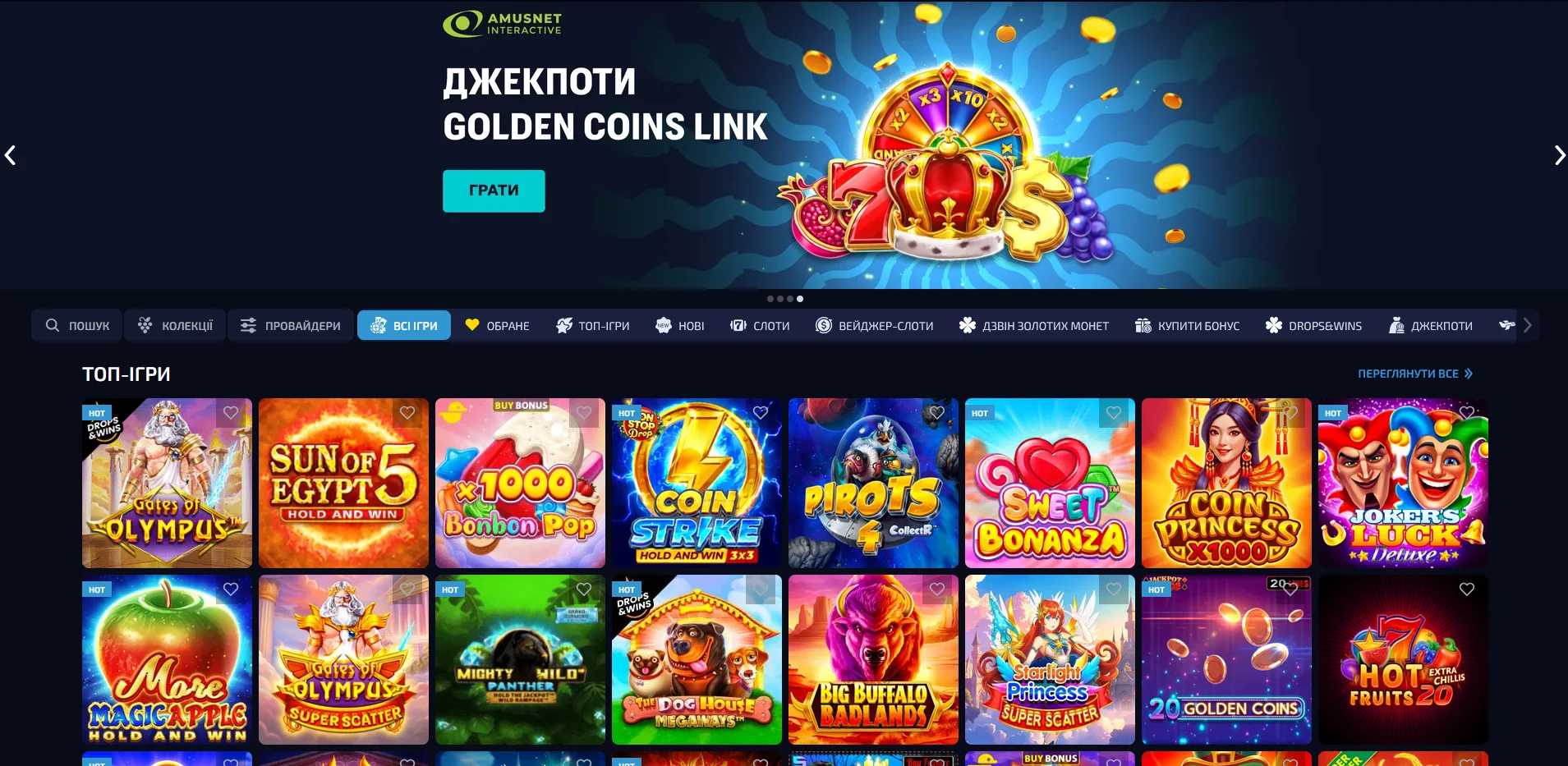 - ігротека — підрозділи «Новинки», «Популярні», «Джекпоти» з сортуванням за брендами (Pragmatic Play 300+, Play'n GO 180+, NetEnt, Yggdrasil тощо);